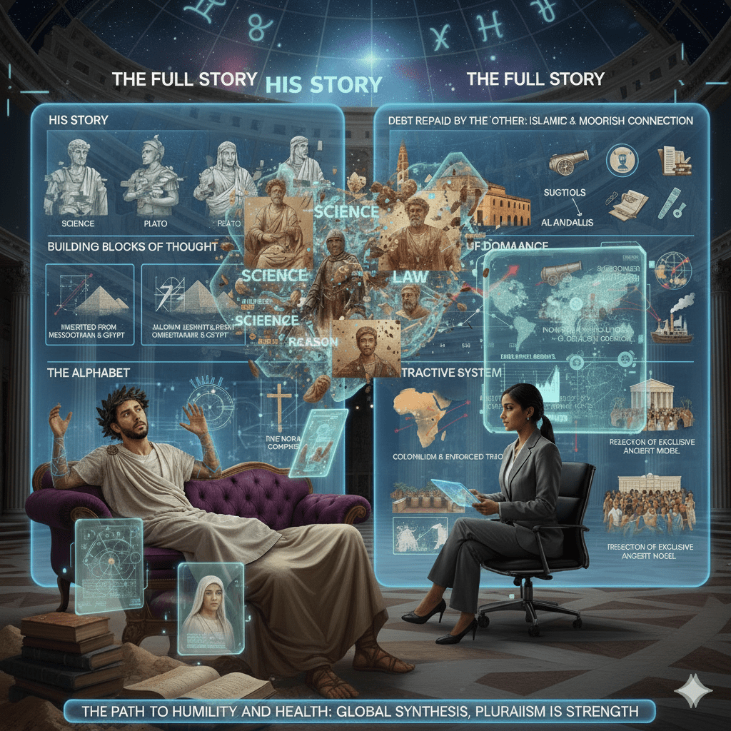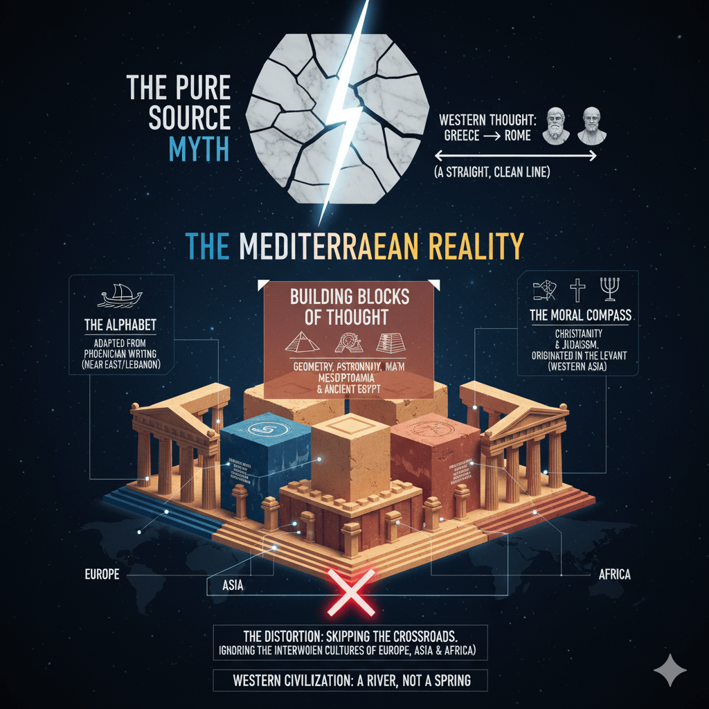 Western culture often points to Ancient Greece and Rome as its pure, original source, but this foundational period was not purely European; it was a vibrant Mediterranean civilization—a crossroads of Europe, Asia, and Africa. The patient must acknowledge these debts:
