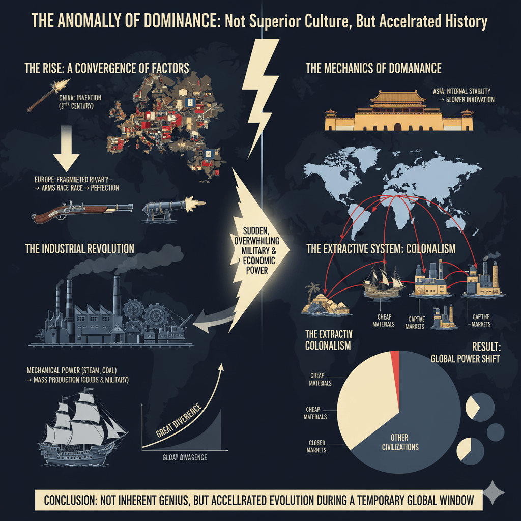 Western global dominance was not an inevitable outcome of superior culture; it was a result of sudden, overwhelming military and economic superiority that emerged late in history.