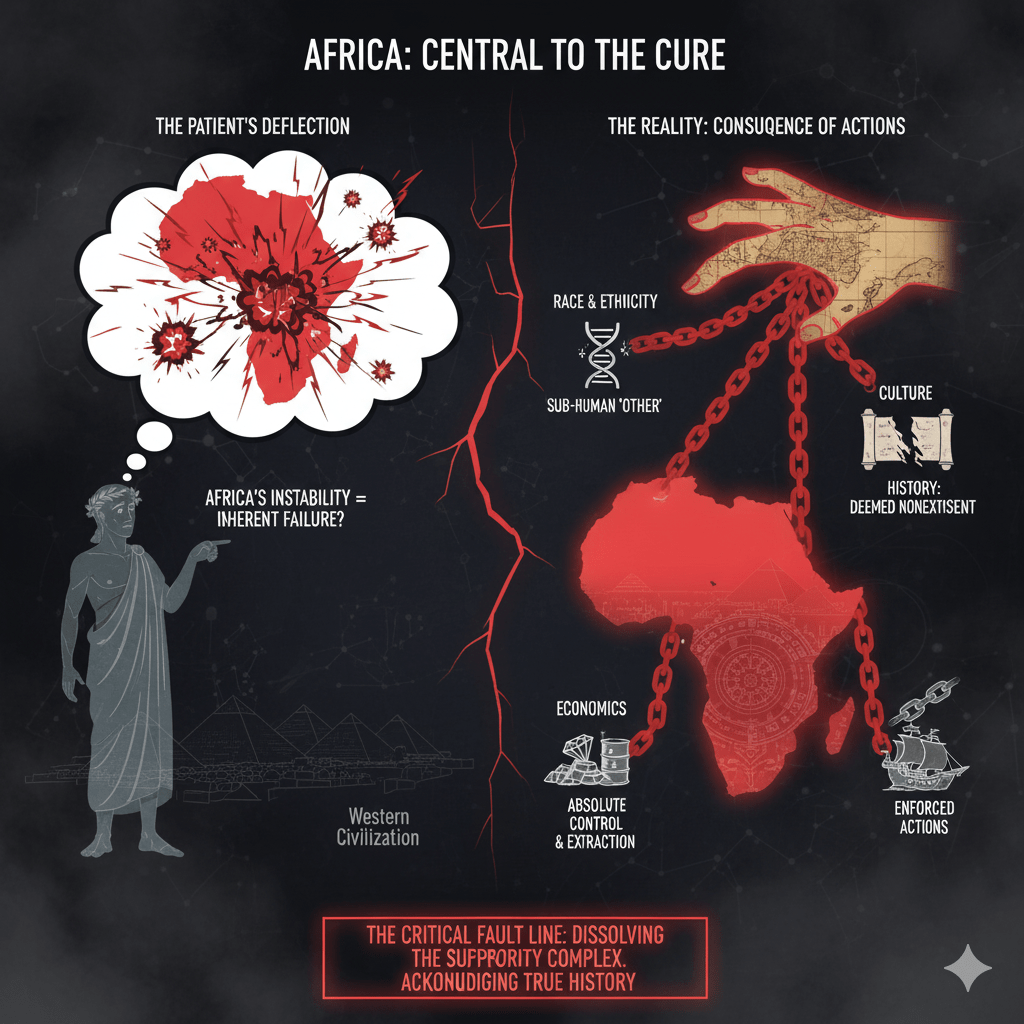 The patient, Western Civilization, must confront the continent of Africa because it represents the critical fault line where the core delusions of the superiority complex were coded into action. For centuries, Africa has served as the ultimate “Other” in the Western narrative—the place whose people were designated as sub-human (Race), whose history was deemed nonexistent (Culture), and whose resources were taken as justification for absolute control (Economics). Therefore, acknowledging the true history of African civilizations and the catastrophic external interference they suffered is the single most powerful step toward dissolving the foundation of white supremacy and healing the patient’s deepest moral flaw. Pointing to Africa’s modern instability as a sign of inherent failure is simply the last, desperate act of the superiority complex.