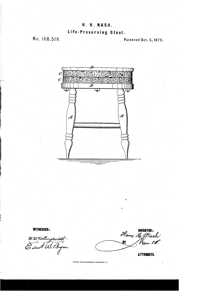 - Accessibility: Nash suggests that buoyant stools are more reliable than life preservers “ordinarily employed, which latter are generally stored away in out-of-the-way places.” The stool is always readily available for use.