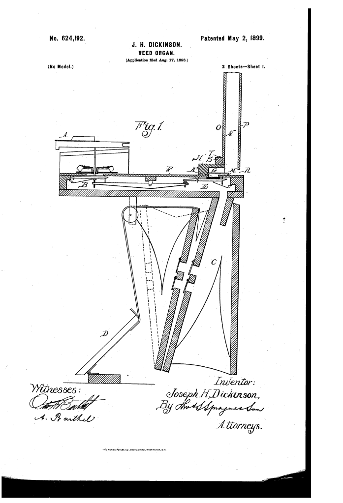 The patent by Joseph H. Dickinson of Detroit, Michigan, describes certain new and useful Improvements in a Reed-Organ (Patent No. 624,192, 1899), relating more particularly to the qualifying-tubes (or acoustic chambers). The object is to improve the construction and arrangement of these tubes to provide unobstructed access to each reed for tuning, while greatly improving the quality and volume of the sound.