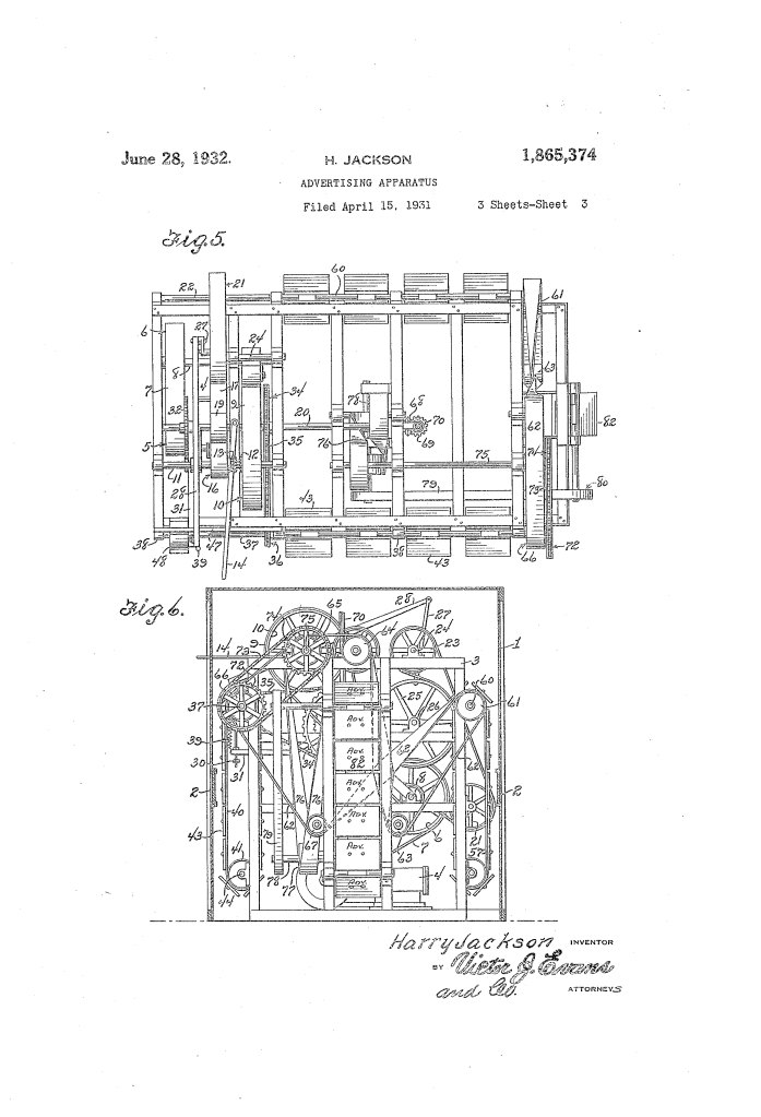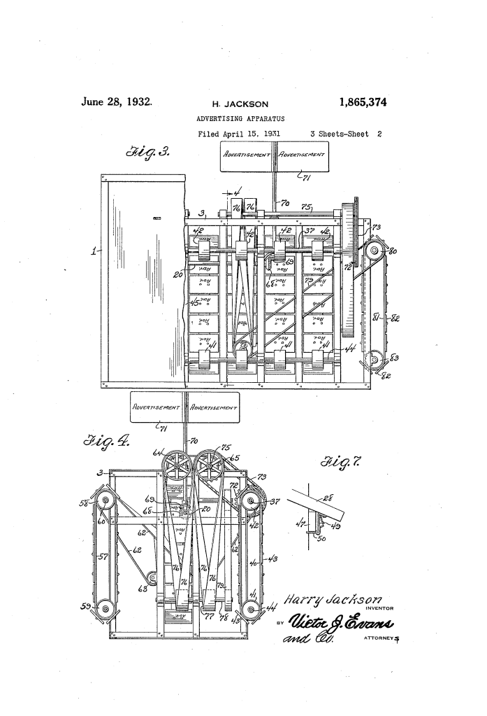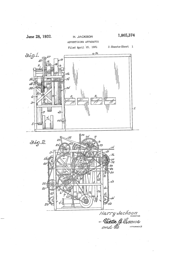 Patented in 1932 by Harry Jackson, this invention is a complex mechanical billboard designed for the early era of mobile marketing. Intended to be mounted on the back of a truck, the device uses a single gasoline or electric motor to synchronize several different advertising displays: vertical scrolling plates on the sides and rear, and rotating vanes on the roof.