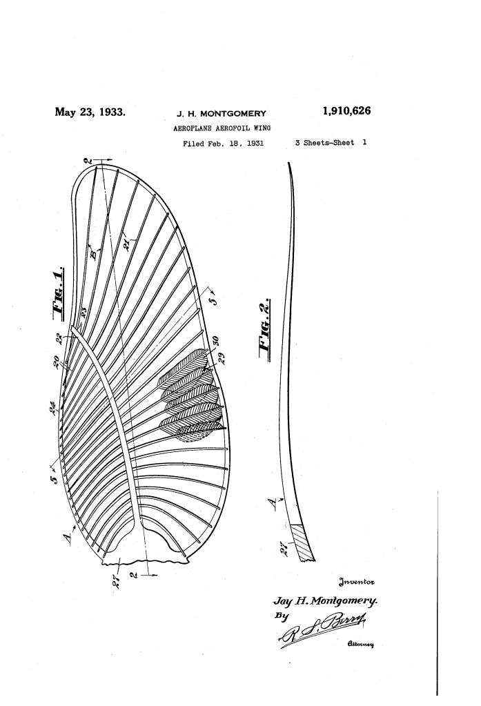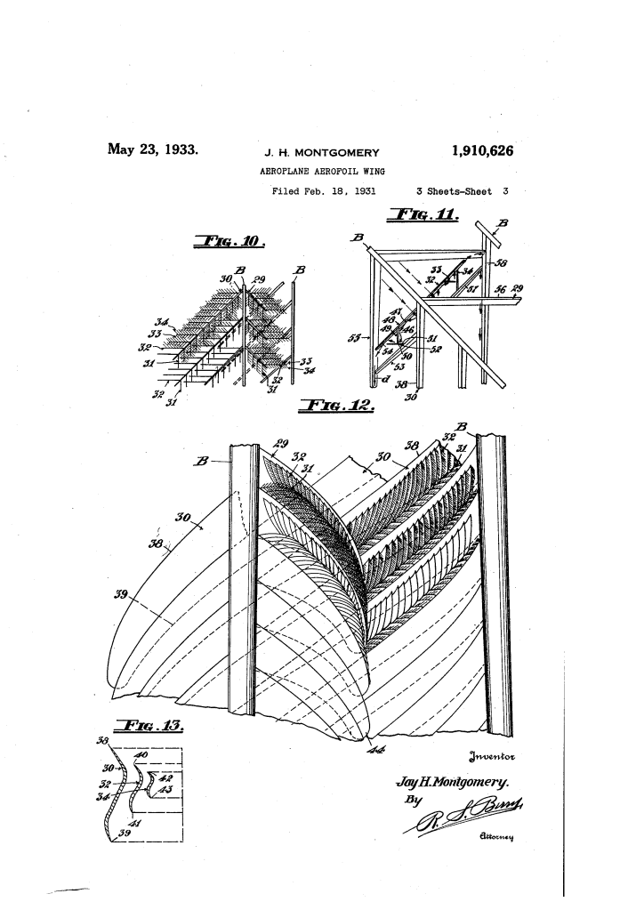 Aeroplane Aerofoil Wing, Jay H. Montgomery, Patent No. 1,910,625