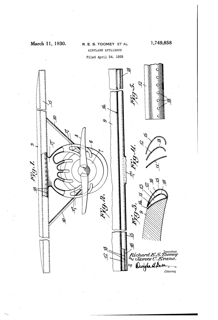 The patent by Richard E. S. Toomey and James C. Evans of Miami, Florida, describes an Airplane Appliance (Patent No. 1,749,858, 1930). This invention is a thermal anti-icing system designed to prevent the accumulation of sleet, snow, and ice on the wings of an aircraft. Toomey and Evans’s primary objective was to eliminate one of the most significant dangers of early aviation: the “freezing” of moisture on wing surfaces, which increases weight, alters aerodynamics, and can make a plane impossible to manage. Their innovation features a dual-chambered heat distribution system that repurposes hot exhaust gases from the engine to heat the wing’s leading edge.