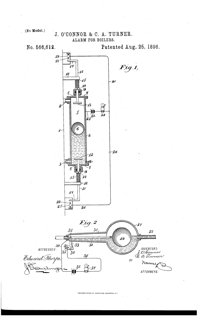 The patent by John O’Connor and Collatinus A. Turner describes an Alarm for Boilers (Patent No. 566,612, 1896). The invention provides a simple and inexpensive device to give electric warning when the water level in a steam boiler rises above or falls below a certain predetermined level.
