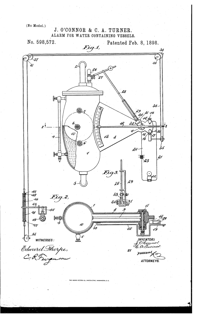 The patent by John O’Connor and Collatinus A. Turner describes an Alarm for Water-Containing Vessels (Patent No. 598,572, 1898). This is an improved safety device designed to give both electric and whistle warning when the water level in a vessel (such as a steam-boiler) rises or falls beyond certain desired levels, and to simultaneously control a water-supply valve.