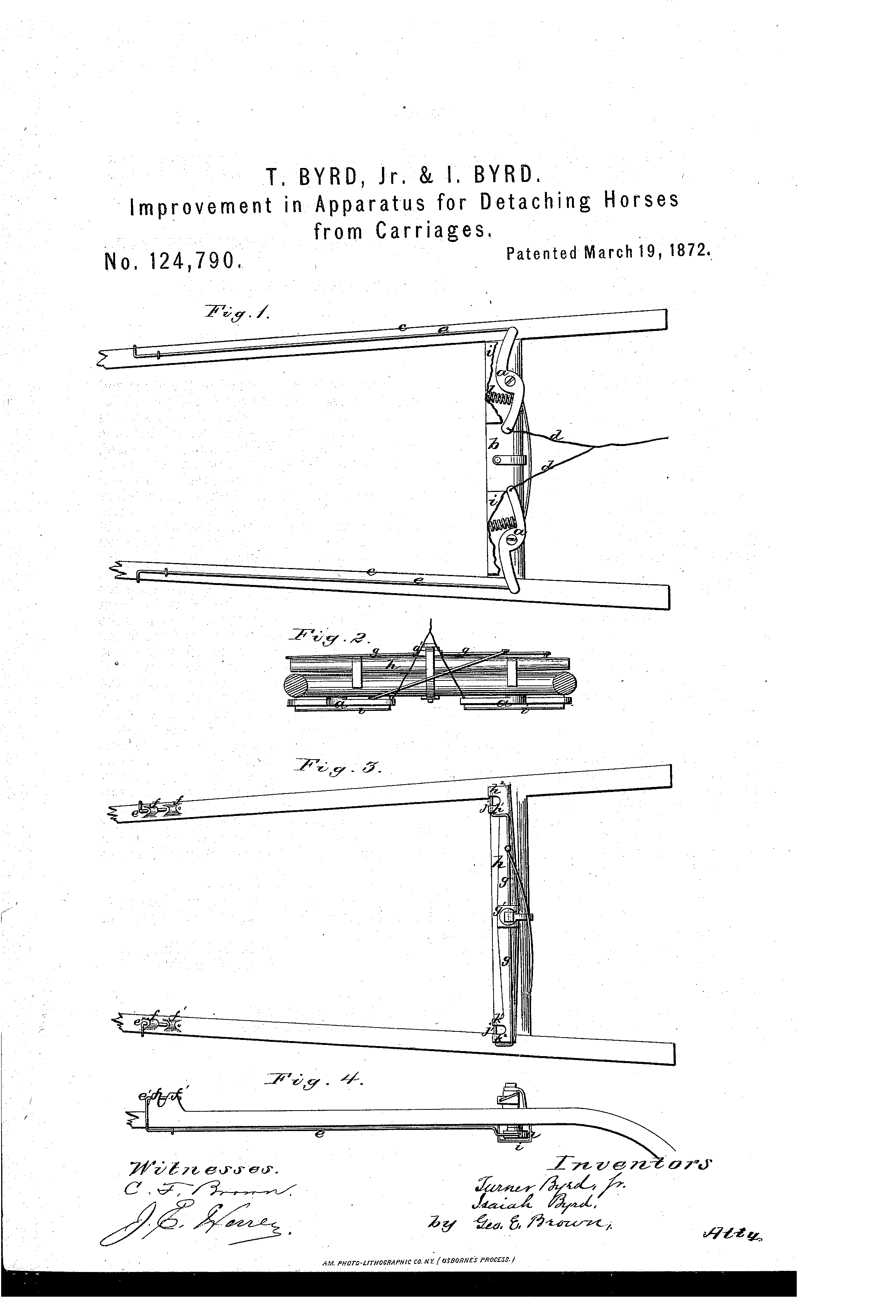 The patent, US124790A, granted to Turner Byrd, Jr., and Isaiah Byrd of Williamsville, Michigan, on March 19, 1872, is for a safety apparatus to quickly detach a horse from a carriage. The invention’s purpose is to allow the occupant of a carriage to “by simply pulling a string, effect the separation of the traces and holdbacks,” thus freeing the horse from the carriage and ensuring the safety of the driver and passengers.
