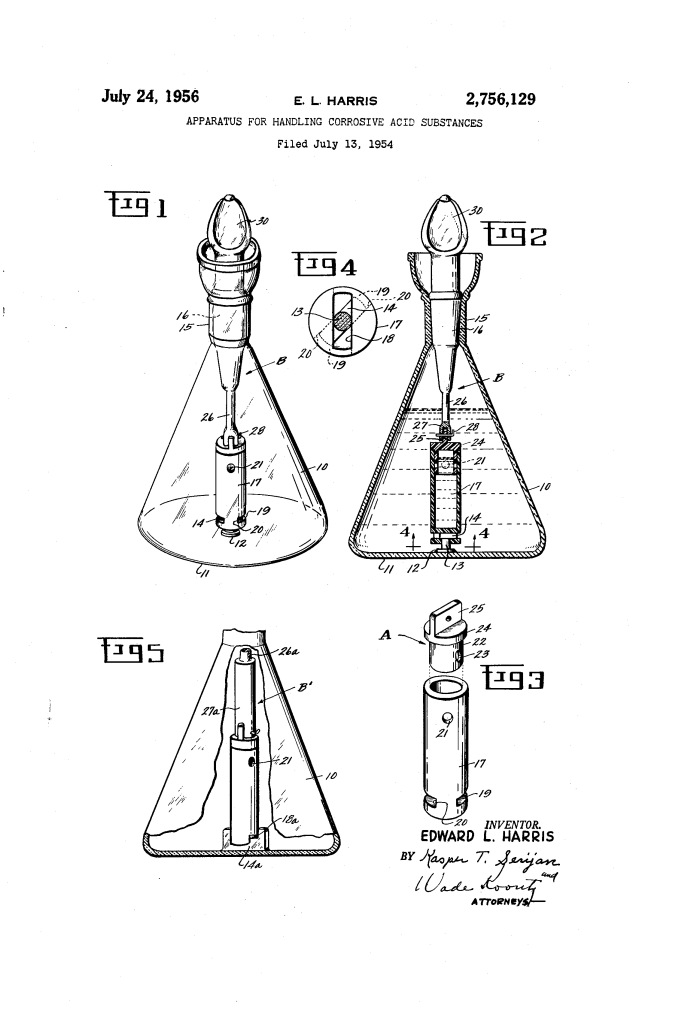 U.S. Patent No. 2,756,129, granted on July 24, 1956, to Edward L. Harris, addresses a critical safety and equipment problem in chemical laboratories: the analysis of “super-corrosives” like hydrofluoric acid and fuming nitric acid.
