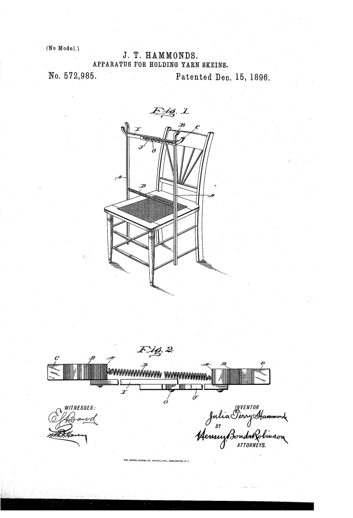The patent by Julia Terry Hammonds of Lebanon, Illinois, describes an apparatus for holding yarn, silk, zephyr, and other material skeins (or hanks) while they are being wound. The objective is to provide a cheap and simple, hands-free means for winding material that is adjustable to the length of the skein and easily attachable to a chair or other support.