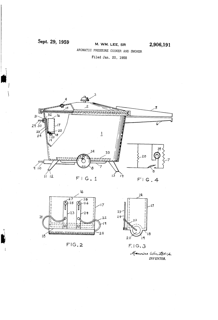 U.S. Patent No. 2,906,191, granted on September 29, 1959, to Maurice Wm. Lee, Sr., addresses a unique culinary challenge: how to infuse foods with authentic wood-smoke flavor while cooking them rapidly under pressure.