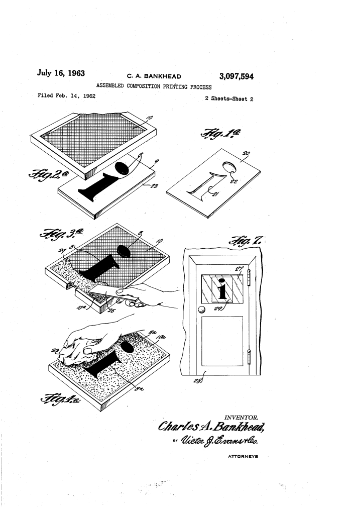 This 1963 patent by Charles A. Bankhead describes an innovative silk screen stencil process (Patent No. 3,097,594). The invention provides a method for creating high-quality, inexpensive printing stencils using “movable type units” made of a gum substance. This allowed small organizations like schools, churches, and small businesses to produce professional signs and posters without expensive photographic equipment or complex hand-cutting.