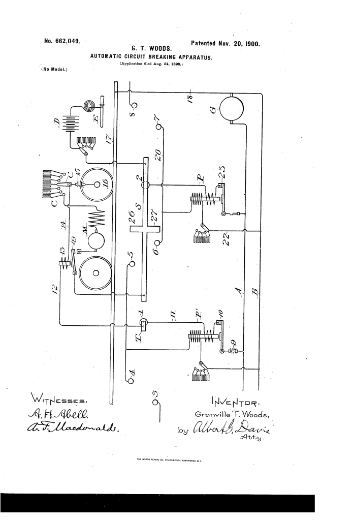 The patent by Granville T. Woods of Monsey, New York, describes an Automatic Circuit-Breaking Apparatus (Patent No. 662,049, 1900) for use with sectional contact electric railways. The key object is to automatically interrupt the action of the driving motor on the car whenever a track-side switch fails to cut power to a section after the car has passed. This compels the operator to stop and attend to the fault.