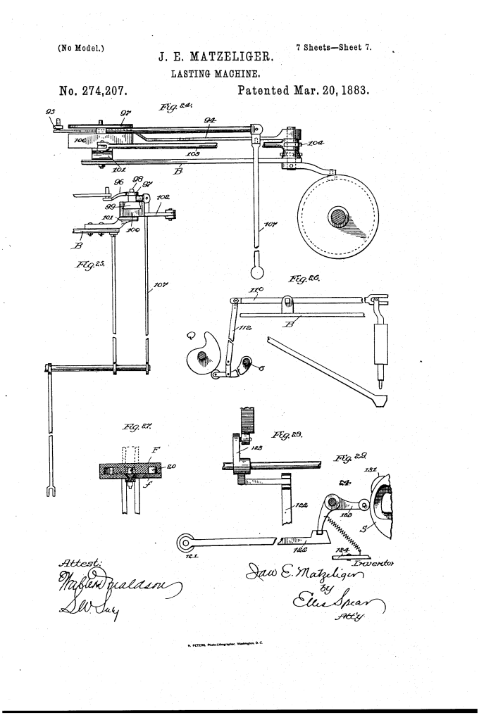 Inventor: Jan Ernst Matzeliger Patent Number: 274,207 (US-0274207-A) Date of Patent: March 20, 1883 Invention: Lasting-Machine