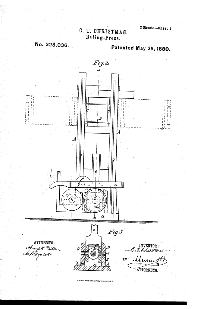 Charles T. Christmas’s patent for a Baling-Press, No. 228,036, describes a machine designed to compress materials like cotton or hay into compact bales. Patented on May 25, 1880, the press was an advanced design for its time, focused on efficiency, power, and uniform pressure.