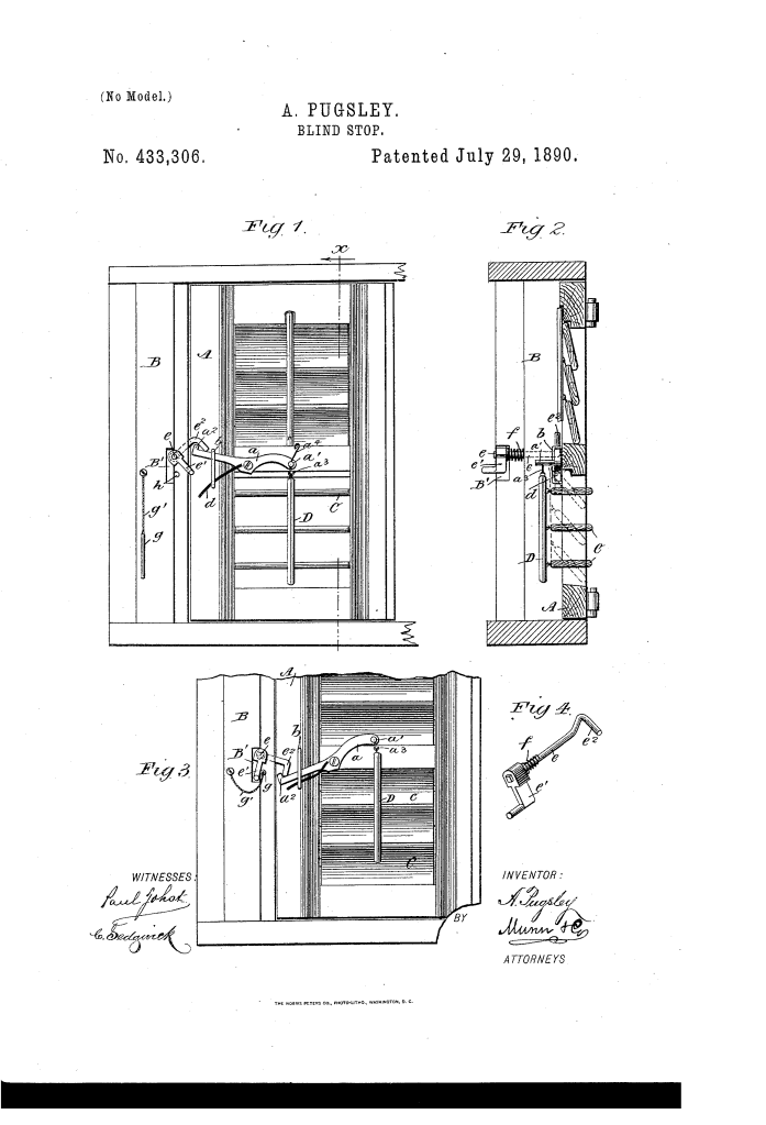 Abraham Pugsley’s patent for a Blind Stop, No. 433,306, describes a device that allows the slats of a window blind to be operated and locked from inside a building. Patented on July 29, 1890, the invention was a system of levers and a shaft that went through the window frame.