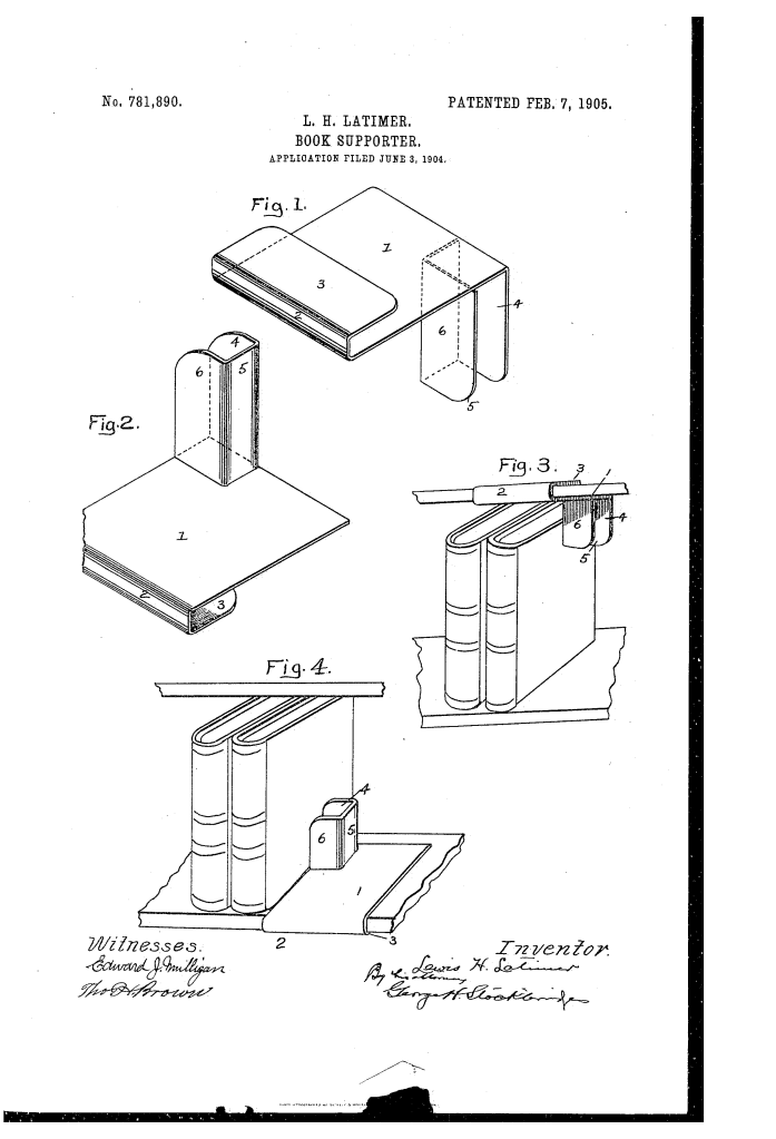 The patent by Lewis H. Latimer describes certain new and useful Improvements in Book-Supporters (Patent No. 781,890, 1905). The well-known need is for a convenient supporter for books on shelves to prevent them from tipping over and becoming distorted. The key features are the device’s adaptability for use at both the top or bottom of books and its ability to be easily manufactured from a single piece of sheet metal.