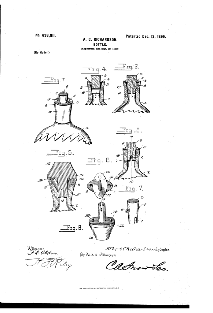 The patent by Albert C. Richardson of South Frankfort, Michigan, describes a new and useful improvement in Bottles or analogous receptacles (Patent No. 638,811, 1899). The object is to provide a simple and comparatively inexpensive bottle with a stopper that can be adjusted to either fully close the neck or to partially open the same, allowing the contents to be poured out in small, controlled quantities.