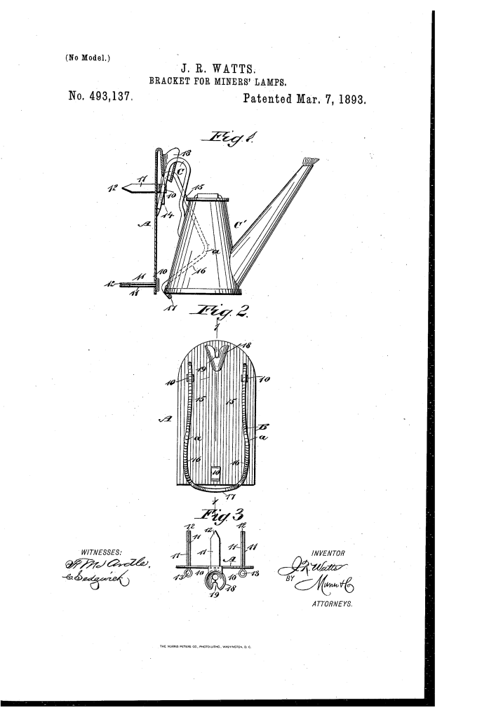 Bracket for Miners’ Lamps (Julius R. Watts, No. 493,137)