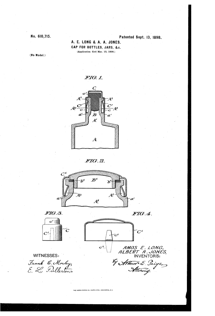 The patent by Amos E. Long and Albert A. Jones of Philadelphia, Pennsylvania, describes a closure for vessels called a Cap for Bottles, Jars, &c. (Patent No. 610,715, 1898). The invention is designed for vessels intended to be used but once, and its object is to provide a closure that indicates by its condition whether the vessel has been opened or not (tamper-evident).