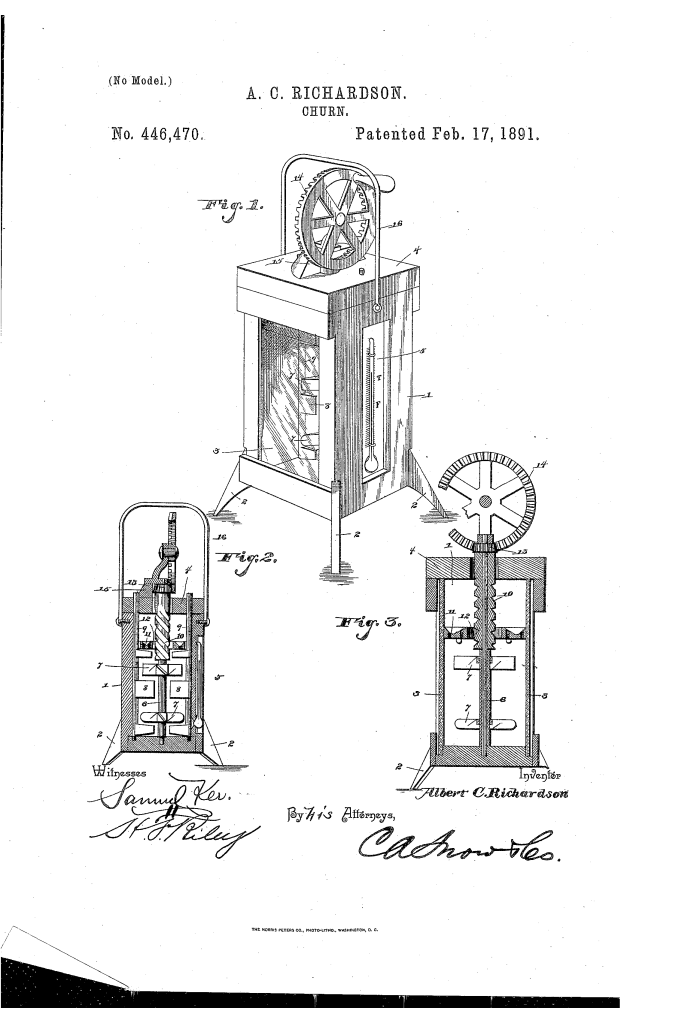 Description: Albert C. Richardson’s patent for a “Churn” was a machine designed to make butter more efficiently. The invention included a rectangular churn body mounted on legs. Its key innovations were: