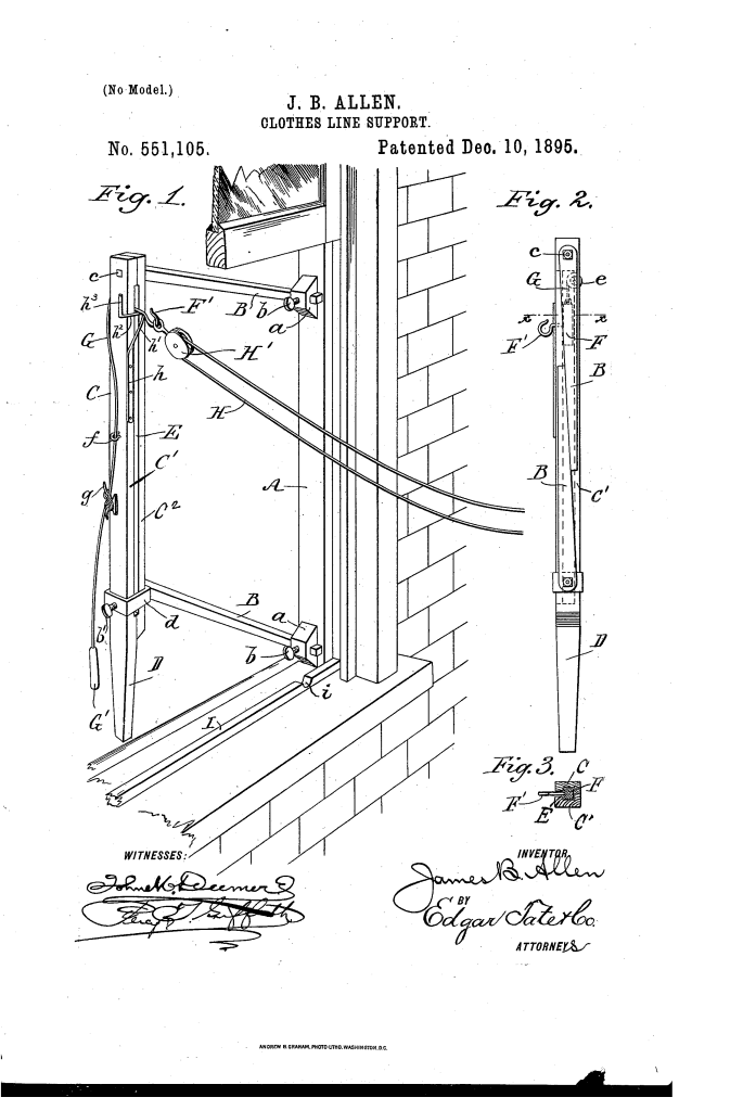 James B. Allen’s 1895 patent addresses a common but persistent challenge in urban and suburban home life before the advent of clothes dryers.