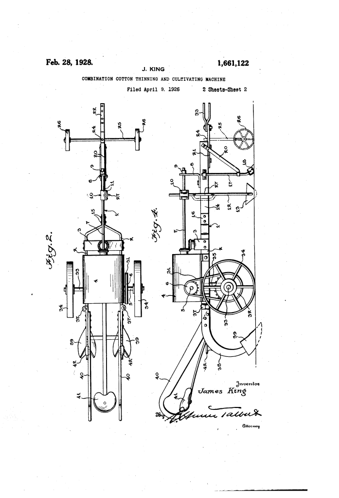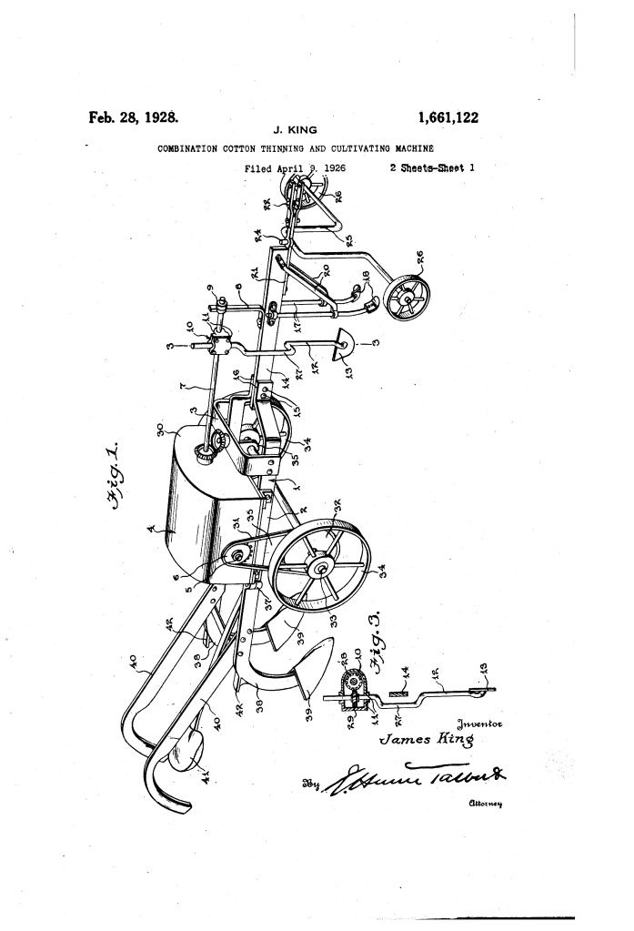 The patent by James King of Kansas City, Missouri, describes a Combination Cotton Thinning and Cultivating Machine (Patent No. 1,661,122, 1928). This invention is a multi-purpose agricultural implement designed to streamline the maintenance of cotton crops. King’s primary objective was to combine two essential labor-intensive tasks—”thinning” (removing excess plants to allow the strongest to grow) and “cultivating” (breaking up soil and removing weeds)—into a single pass. His innovation features a unique crank-driven rotating blade that produces a specialized shearing action to “top” or thin the plants.