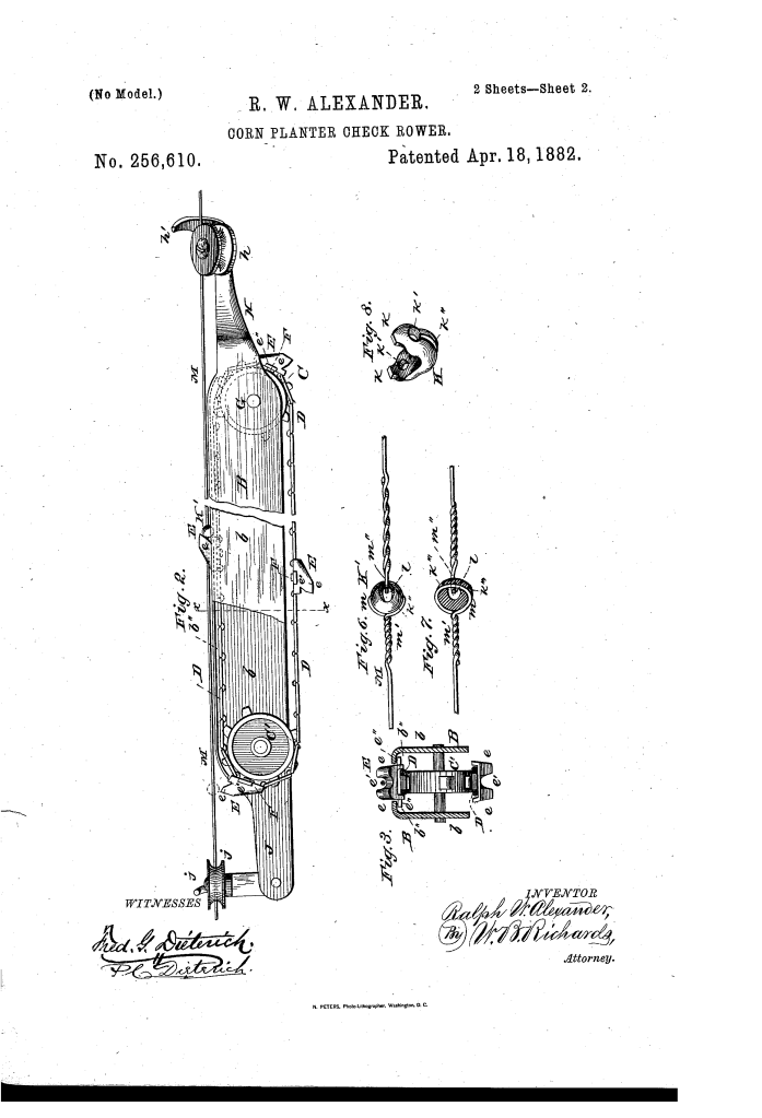 Ralph W. Alexander’s patent for a Corn-Planter Check-Rower, No. 256,610, describes a device for a horse-drawn corn planter that ensured corn seeds were planted in straight, evenly spaced rows. Patented on April 18, 1882, the invention was an improvement on previous check-rowers that often jammed.