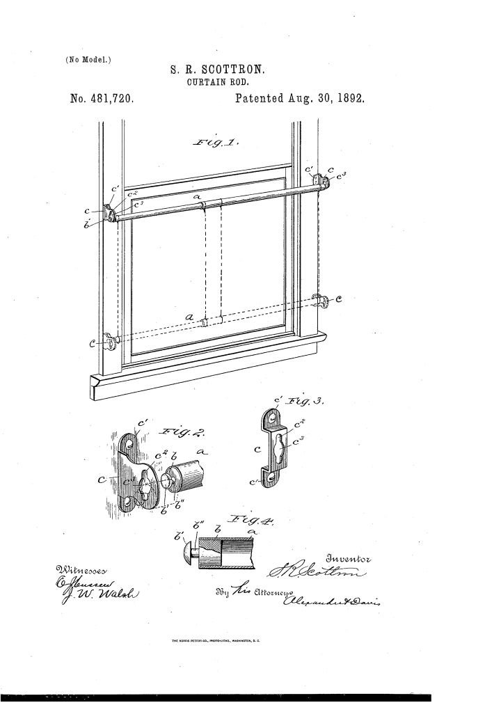 Samuel R. Scottron’s patent for a Curtain Rod, No. 481,720, describes a telescoping curtain rod with a unique mounting system. Patented on August 30, 1892, the invention was designed to make a curtain rod easy to install and remove without screws, while ensuring it was secure against accidental displacement.