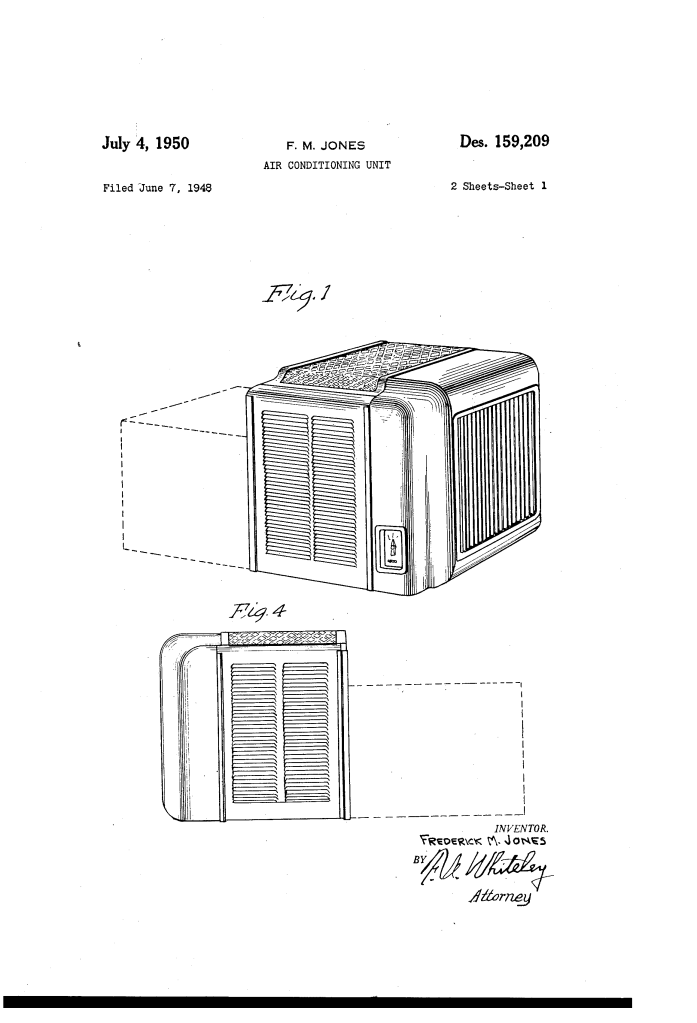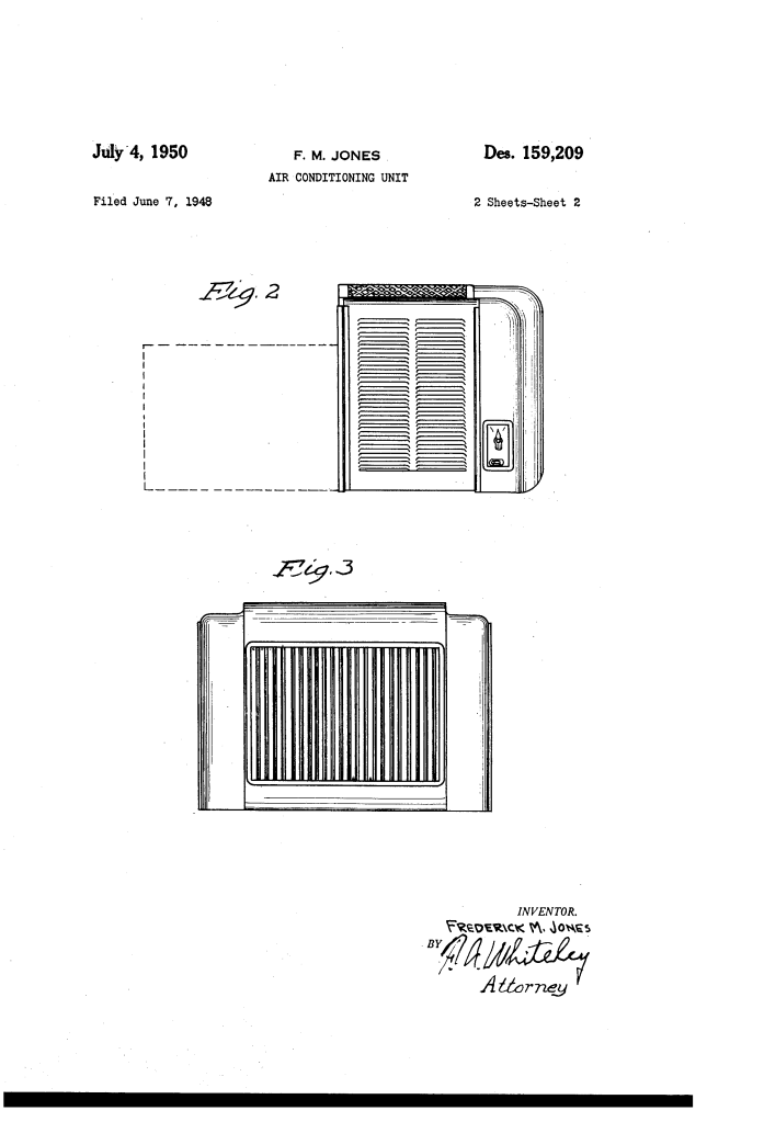 Patented on July 4, 1950, this design patent (U.S. Patent No. Des. 159,209) represents the aesthetic and structural maturation of Frederick M. Jones’s world-changing refrigeration technology. While his previous patents focused on the “guts” of the machine—the compressors and control systems—this patent protects the unique industrial design of the unit itself.