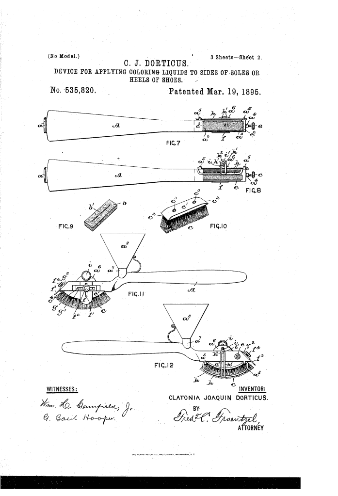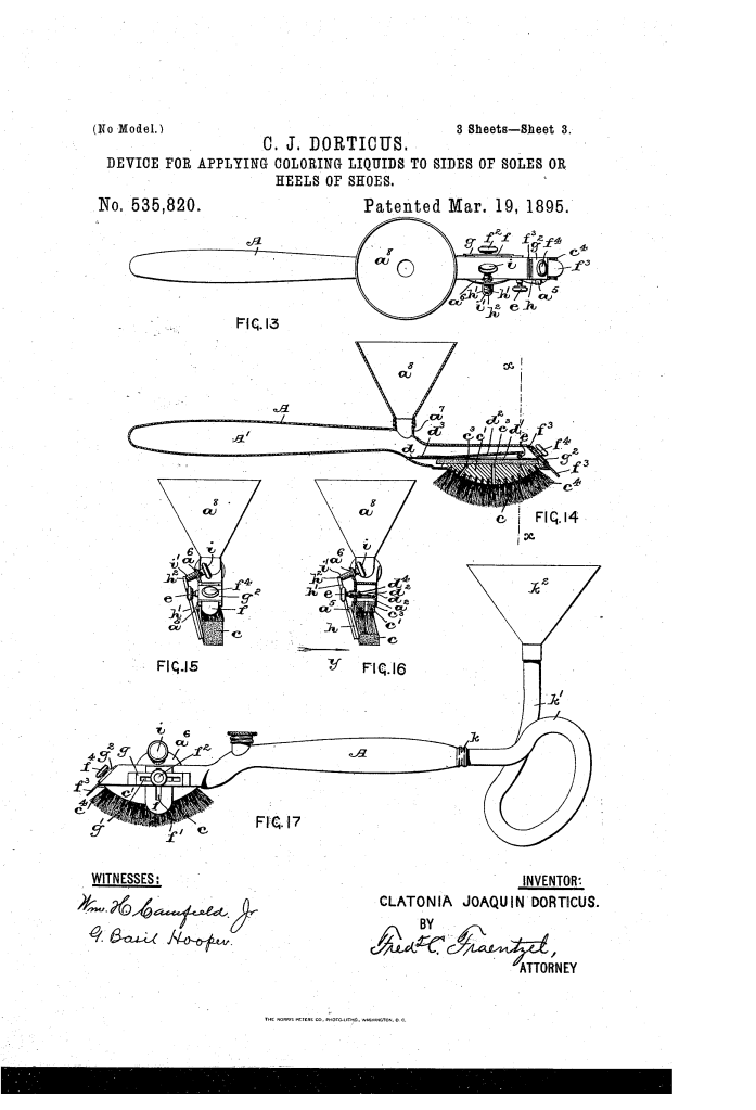 The patent by Clatonia Joaquin Dorticus of Newton, New Jersey, describes a novel device for applying coloring liquids (ink or stain) to the edges or sides of the soles or heels of shoes. The primary goal is to produce a bright, professional finish on these parts of the footwear while preventing staining of the soft upper leather (vamp) or the bottom of the sole, saving time and improving product quality.