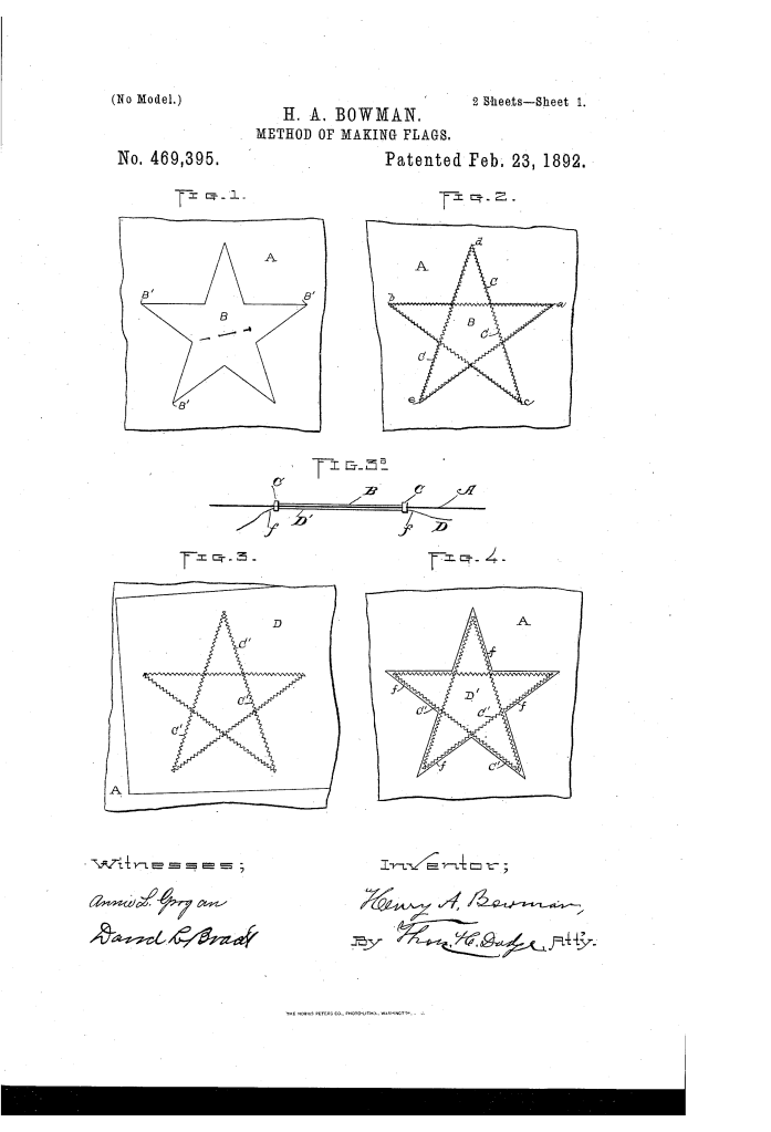 Henry A. Bowman’s patent for a Method of Making Flags, No. 469,395, describes an innovative process for efficiently manufacturing flags with emblems on both sides. Patented on February 23, 1892, the invention’s key contribution was a method for ensuring that emblems, such as the stars on the U.S. flag, were perfectly aligned on both sides without requiring a skilled operator to measure or align them manually.