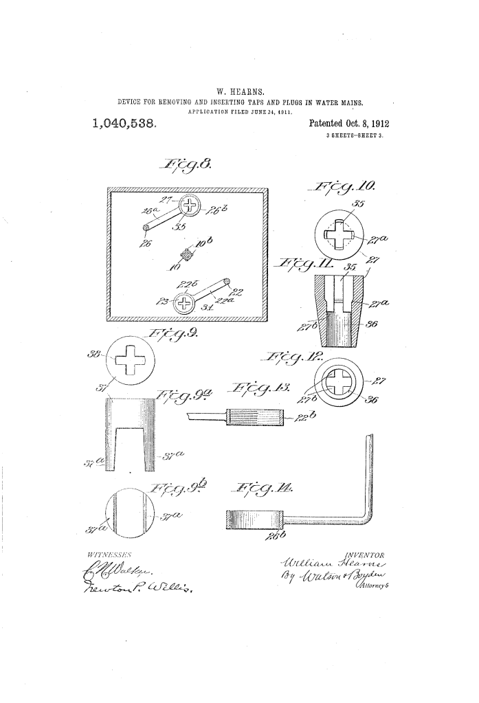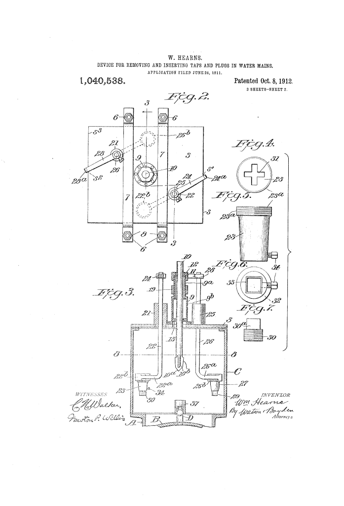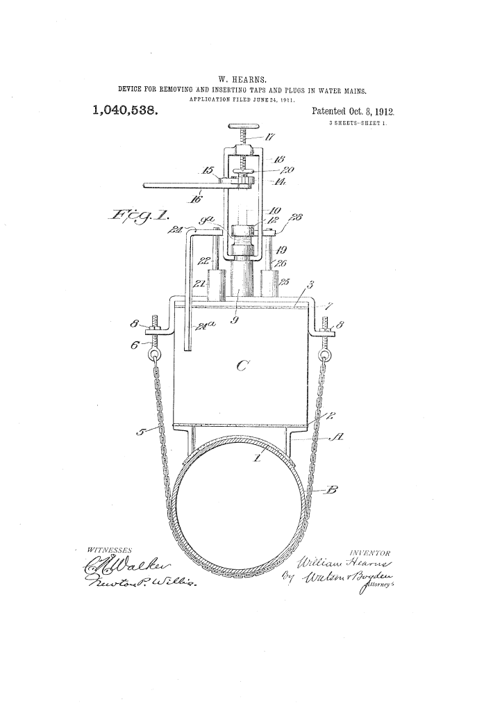 The patent by William Hearns of Washington, D.C., describes a Device for Removing and Inserting Taps and Plugs in Water-Mains (Patent No. 1,040,538, 1912). This invention is a specialized pressurized chamber—a “tapping machine”—that allows municipal workers to remove old pipes or insert new plugs into main water lines without shutting off the water supply to the rest of the city.