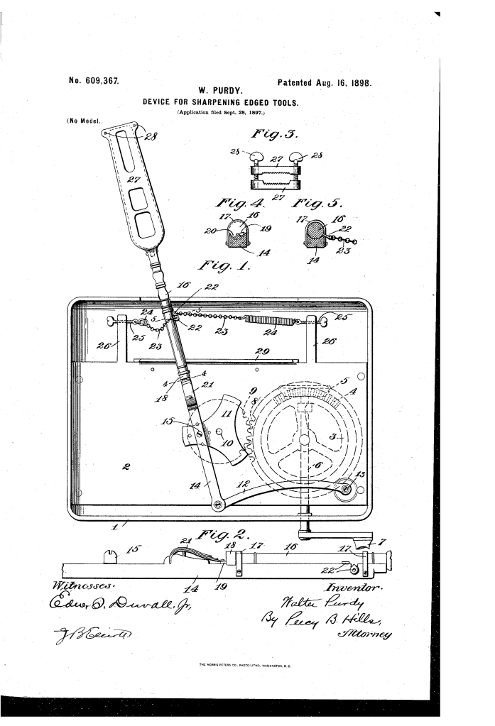 Device for Sharpening Edged Tools (Walter Purdy, No. 609,367)