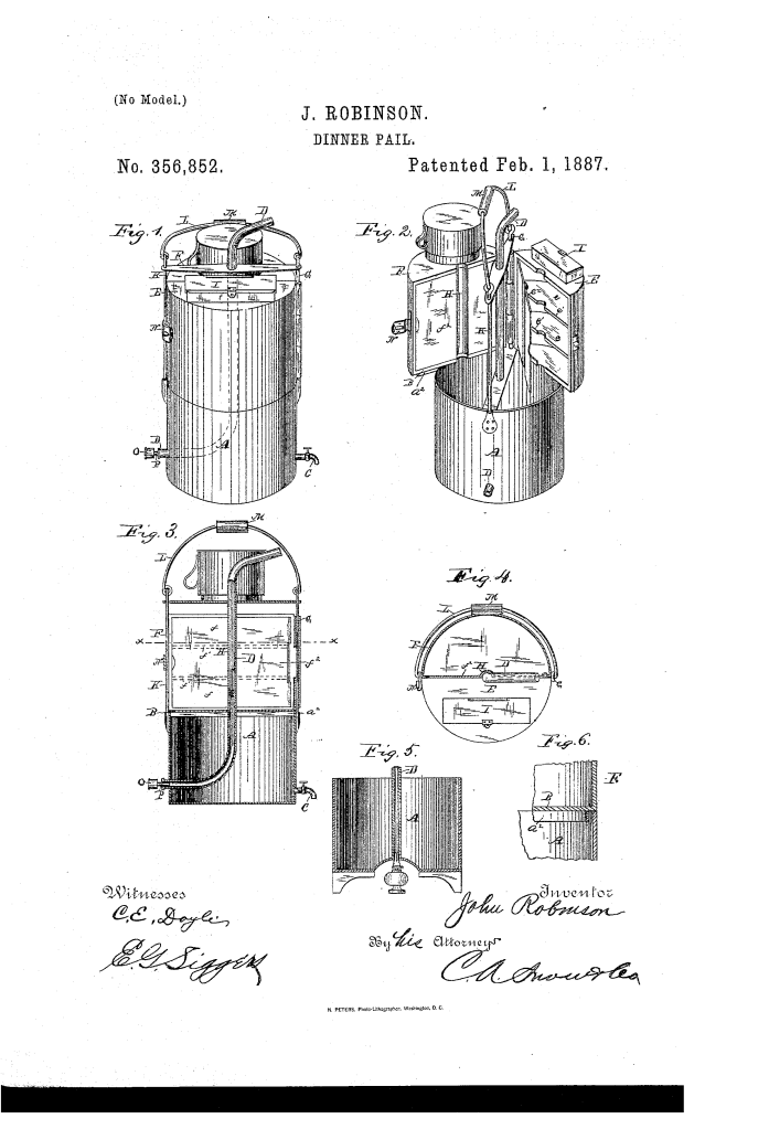 The patent by John Robinson of Coal Valley, West Virginia, describes an improvement in Dinner-Pails (Patent No. 356852, 1887). The invention is a multi-compartment lunch container designed specifically for workmen, featuring an integrated heating system that allows the user to warm both their beverage and their food simultaneously using a small lamp.