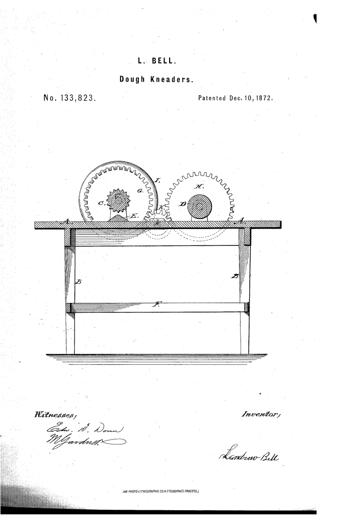 Inventor: Landrow Bell Patent Number: 133,823 Date of Patent: December 10, 1872 Invention: Improvement in Dough-Kneaders