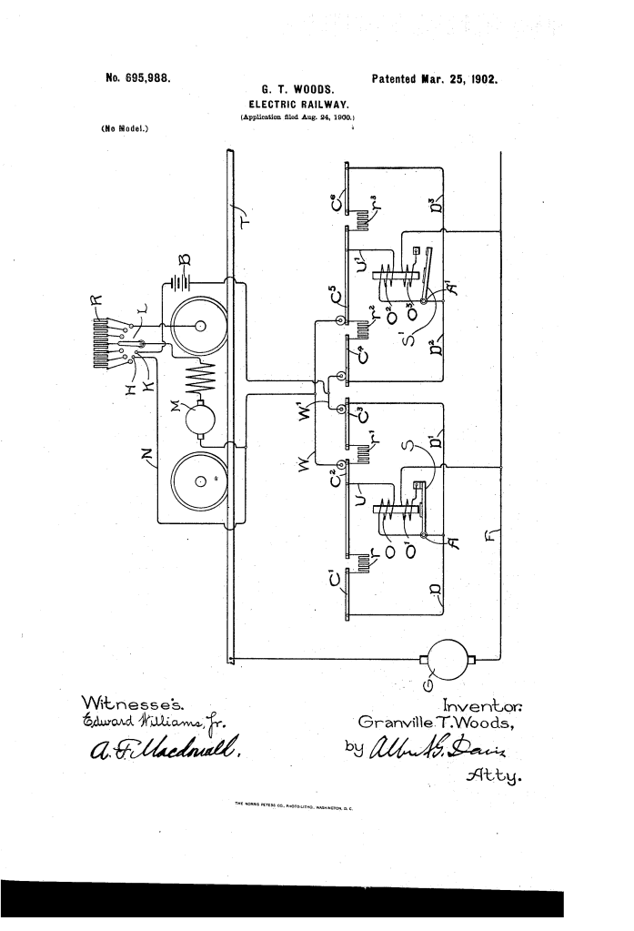 The patent by Granville T. Woods of New York, N.Y., describes certain new and useful Improvements in Electric Railways (Patent No. 695,988, 1902). The invention relates to sectional-conductor electric railways and provides novel means for successively energizing the conductor-sections as the car advances.