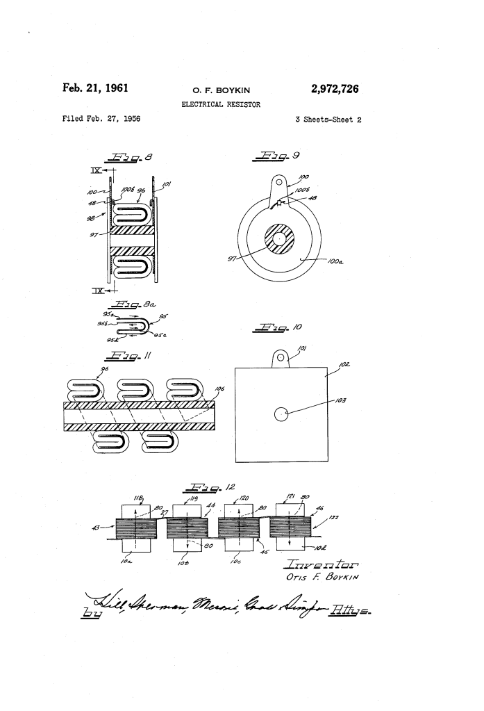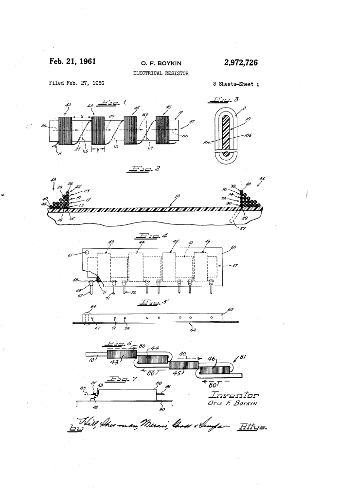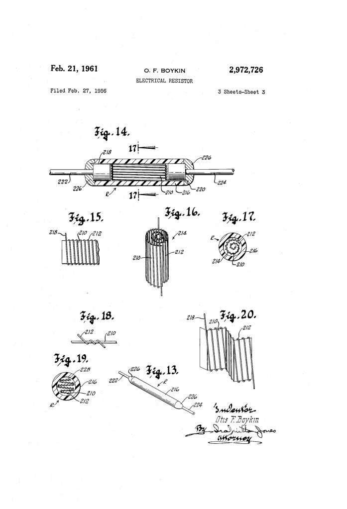 U.S. Patent No. 2,972,726, granted on February 21, 1961, to Otis F. Boykin, describes a revolutionary method for manufacturing high-precision electrical resistors. Otis Boykin, an African American inventor and engineer, addressed a critical failure in the electronics of the era: traditional resistors were bulky, fragile under extreme conditions, and suffered from unwanted “inductive effects” (interference) caused by the way the wire was wound.