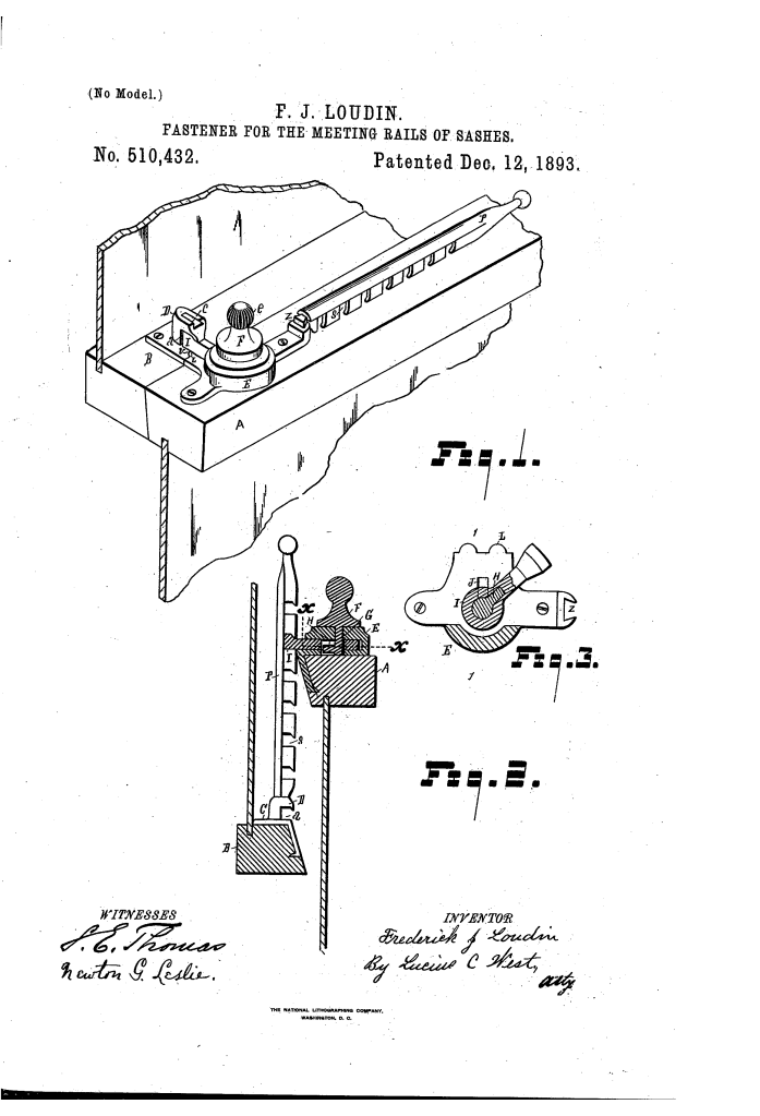 Frederick J. Loudin’s patent describes a highly secure and functional locking mechanism for double-hung window sashes (windows with two vertically sliding sections). The invention aims to improve upon existing sash fasteners by focusing on security, ventilation, and resistance to forced entry.