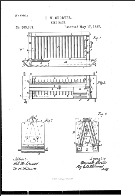 On May 10, 1887, Dennis W. Shorter, an African-American inventor from Baltimore, Maryland, was granted U.S. Patent No. 363,089 for a feed rack. This invention was designed to improve the way hay, corn fodder, and other feed were stored and dispensed to livestock.