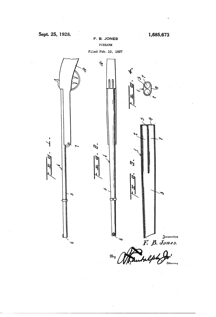 The patent by Felix B. Jones of Chicago, Illinois, describes an improved Firearm (Patent No. 1,685,322, 1928). This invention is a unique shotgun barrel design that combines the capacity of a double-barrel shotgun with the lightweight, streamlined profile of a single-barrel gun. Jones’s primary objective was to reduce the weight and manufacturing expense of traditional multi-barrel firearms while simplifying the cleaning process for the operator. His innovation centers on a split-breech architecture where two independent firing chambers merge into a single, tapered muzzle bore.