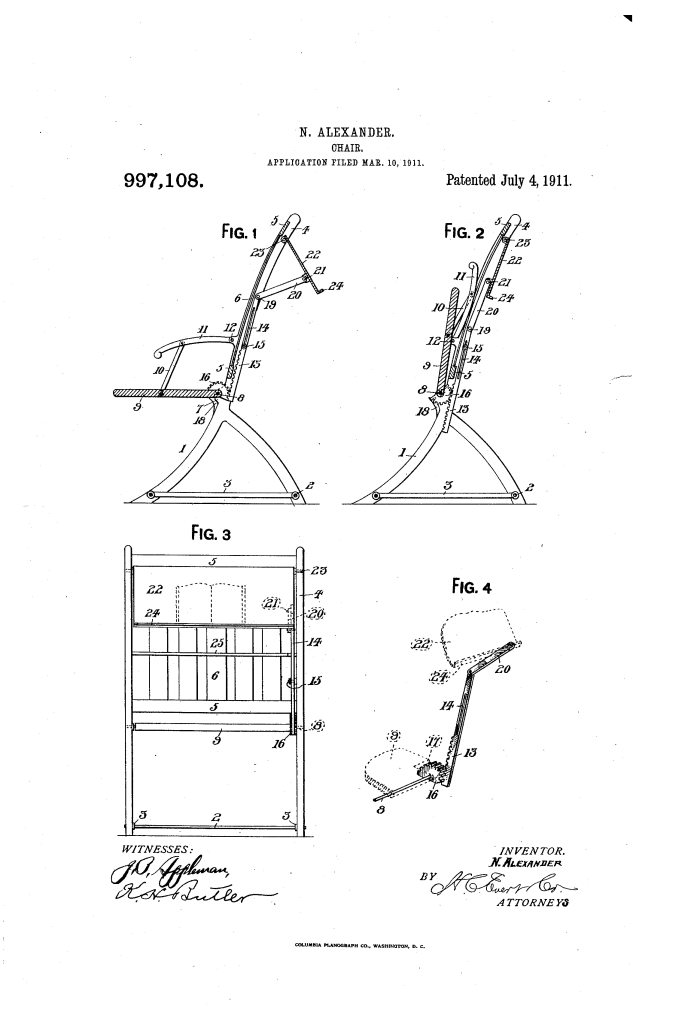 The patent by Nathaniel Alexander of Lynchburg, Virginia, describes an improvement in Chairs (Patent No. 997,031, 1911). The invention is a specialized folding chair designed for churches, Sunday schools, and auditoriums. Its primary feature is a synchronized book rest that automatically deploys when the seat is lowered and folds compactly against the back when the seat is raised.