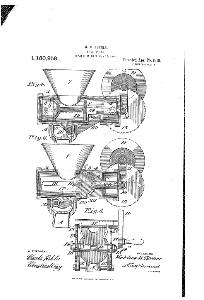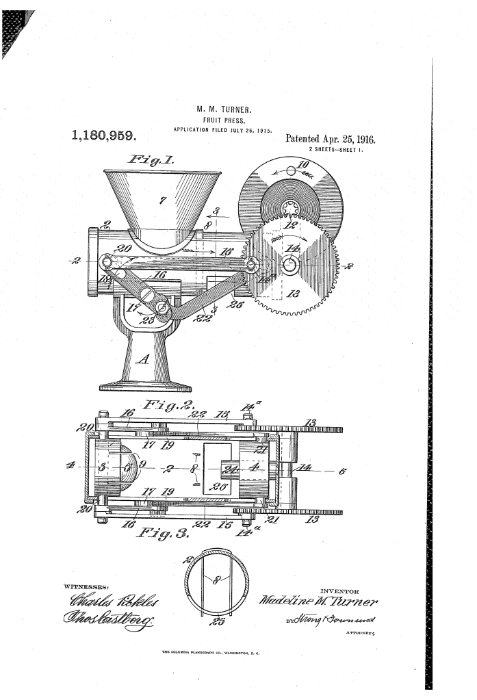 Madeline M. Turner’s fruit press influenced the development of commercial food processing equipment and synchronized machinery.