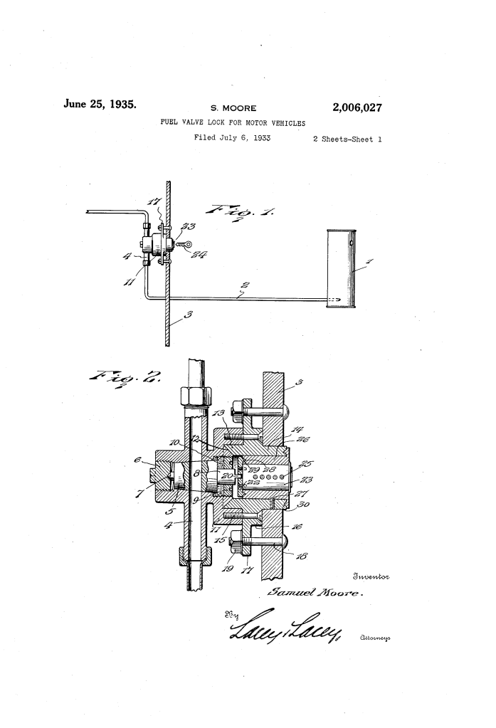 The patent by Samuel Moore describes a Fuel Valve Lock for Motor Vehicles (Patent No. 2,006,027), issued on June 25, 1935. This invention is a key-operated security mechanism that physically interrupts the flow of gasoline between the supply tank and the carburetor, effectively immobilizing the vehicle against unauthorized use.