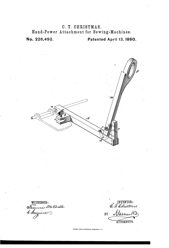 The patent by Charles T. Christmas of Riverton, Mississippi, describes a new and improved Hand-Power Attachment for Sewing-Machines (Patent No. 226,492, 1880). The object is to provide an attachment that allows the sewing-machine to be driven by hand alone, or to be used to assist the operation of the machine by foot, thereby relieving the operator of continuous work with the feet.