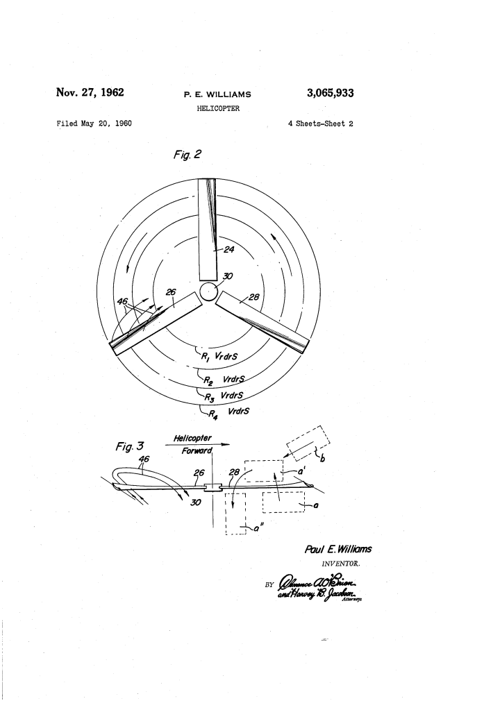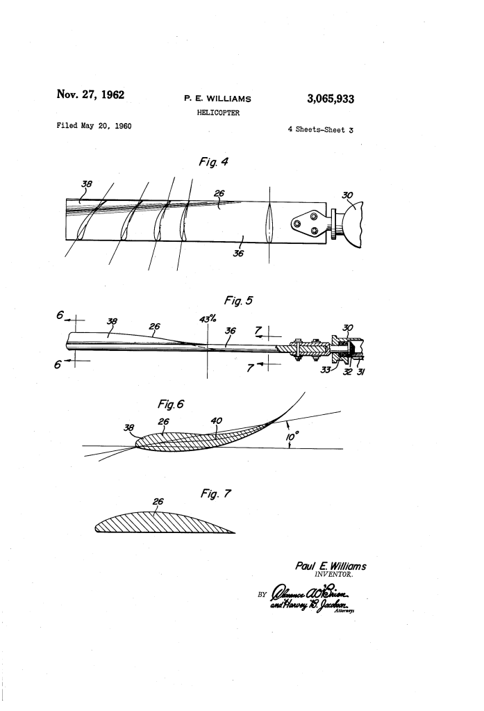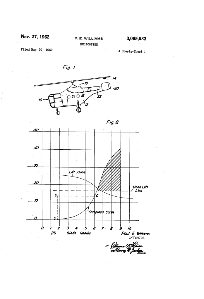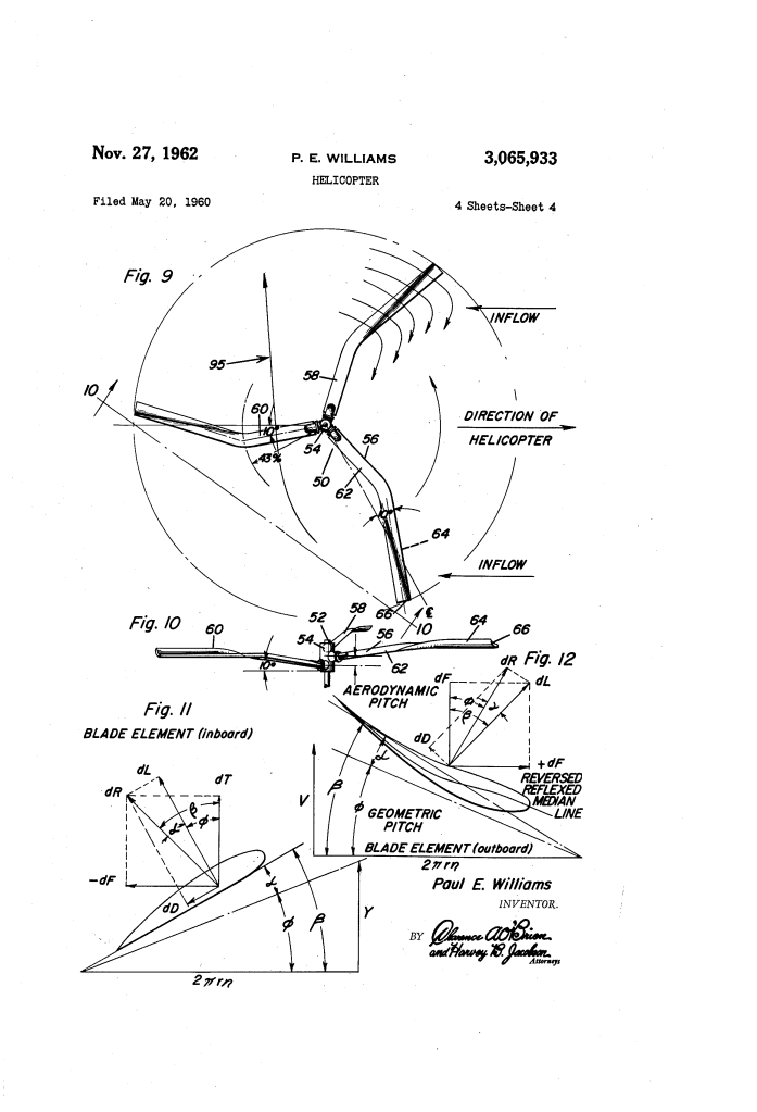 The Paul E. Williams Helicopter Patent (No. 3,065,933), granted on November 27, 1962, represents a radical attempt to rethink helicopter aerodynamics. Williams’ goal was to solve three primary headaches of helicopter design: vibration, high torque, and the mechanical complexity of cyclic pitch control.