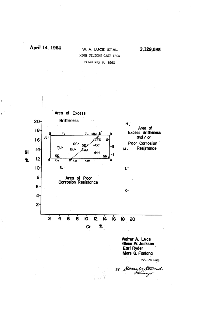 U.S. Patent No. 3,129,095, granted on April 14, 1964, to Walter A. Luce, Glenn W. Jackson, Earl Ryder, and Mars G. Fontana, describes an advanced high-silicon alloy engineered to survive the most punishing chemical environments. Assigned to The Duriron Company of Dayton, Ohio, this invention revolutionized the production of chemical processing equipment and impressed current anodes used in maritime protection.