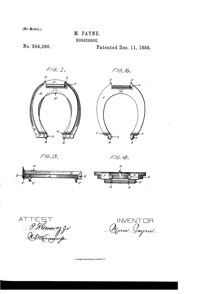 The patent, US394388A, granted to Moses Payne of Belleville, Kentucky on December 11, 1888, is for a supplemental or “spring-shoe” that can be applied to a horse’s foot without removing the existing, nailed-on horseshoe.
