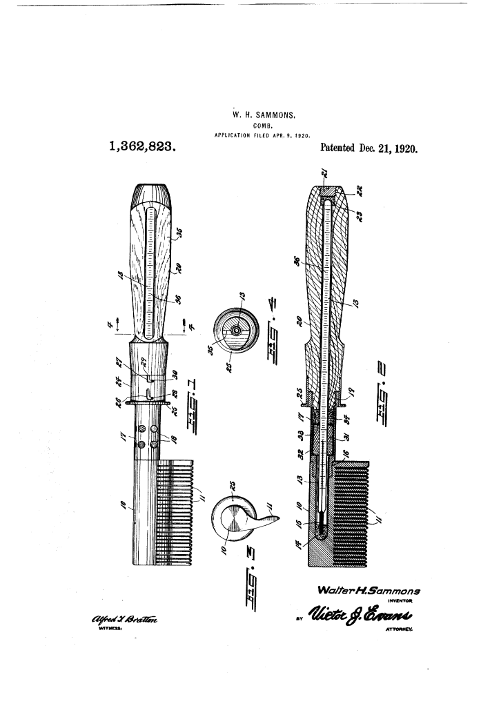 The patent by Walter H. Sammons of Philadelphia, Pennsylvania, describes new and useful Improvements in Combs (Patent No. 1,363,059, 1920). The invention relates to hair straightening or kink removing combs which are heated before application to the hair. The main objective is to provide a comb that overcomes the inherent disadvantages of prior heated combs, specifically the risk of damaging the hair and the injury to the hands of the user.