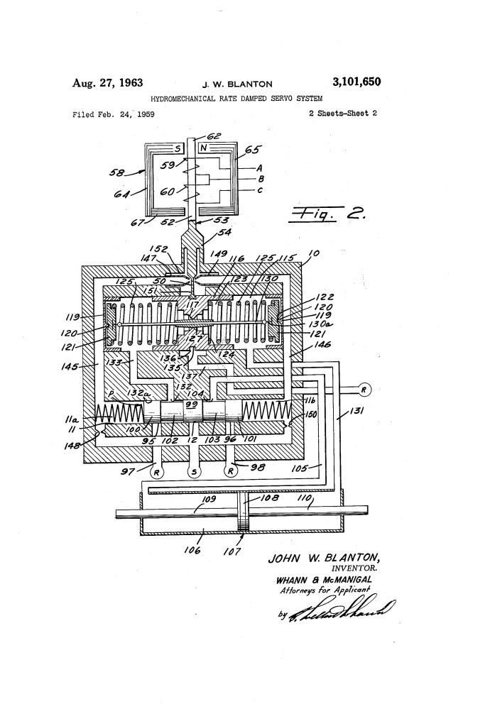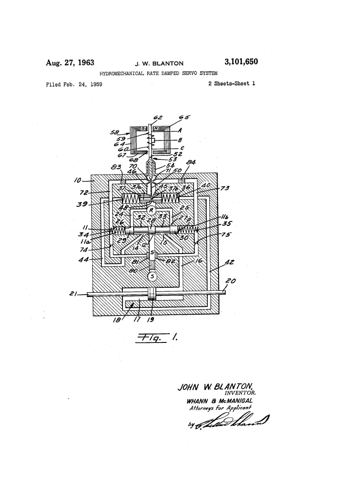 The Hydromechanical Rate Damped Servo System (U.S. Patent 3,101,650), patented by John W. Blanton in 1963, represents a significant leap in control theory—specifically, the creation of a mechanical “lead” constant to manage systems with large dynamic time lags, such as gas turbines or jet engines.