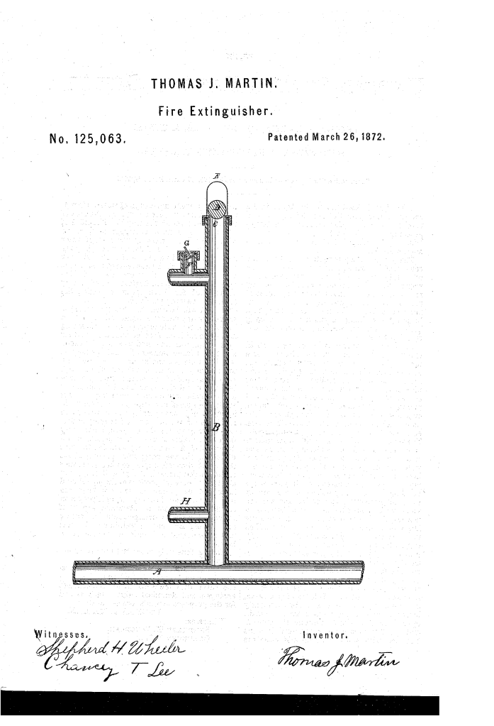 Description of the Invention: Thomas J. Martin’s patent for an “Improvement in Fire-Extinguishers” in 1872 did not describe a portable, hand-held device akin to modern fire extinguishers. Instead, his invention focused on a system of pipes and valves designed to distribute water from a reservoir throughout a building to extinguish or prevent fires.